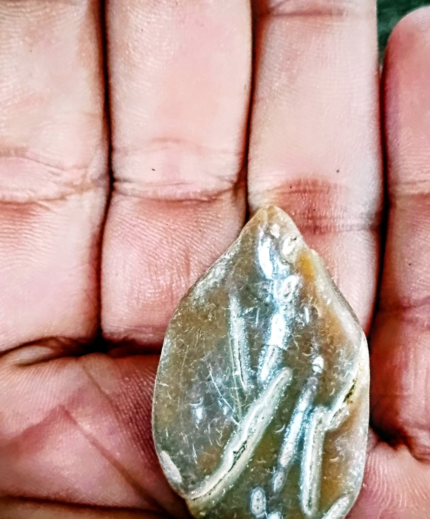I found this stone while at work today. It’s smooth, warm-toned, and has these fascinating white markings that look almost like a secret language etched into the surface.